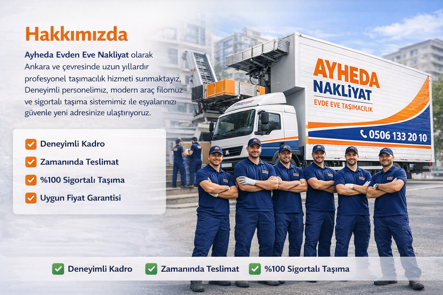 Ankara evden eve nakliyat sektöründe güvenilir ve profesyonel hizmet sunan Ayheda Nakliyat, sigortalı taşımacılık ve asansörlü sistemleri ile eşyalarınızı güvenle yeni adresinize ulaştırmaktadır. Uzman ekibimiz, modern araç filomuz ve müşteri memnuniyeti odaklı çalışma prensibimiz sayesinde taşınma sürecinizi sorunsuz hale getiriyoruz.